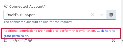 However, we observed an issue while calling an WrkAction - 'Perform an API call in HubSpot’, when attempting to use “Davids's HubSpot” account credentials and confirm the action, it again prompts for authentication (Screen shot below) – “Additional permissions are needed to perform this Wrk Action. Click here to grant permission.”